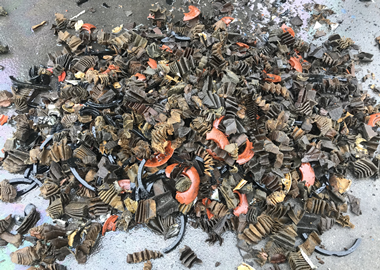 濾油器通過(guò)四軸撕碎機(jī)進(jìn)行初級(jí)破碎,破碎成60mm塊狀,通過(guò)震動(dòng)篩,使出料的成品均勻到下個(gè)工段,同時(shí)把里面的油震出來(lái)。經(jīng)磁選機(jī)將物料中的鐵跟紙分離,廢鐵通過(guò)錘式破碎機(jī)破碎成小的球狀,再清洗烘干變成純干鐵,油紙則經(jīng)過(guò)脫油變成干紙。